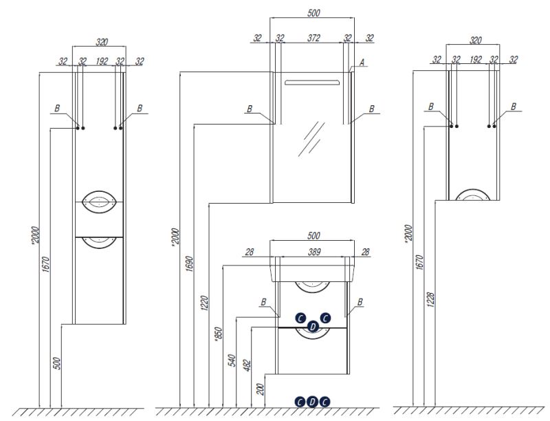 - Зеркальный шкаф (2 регулируемые полки из стекла, петли с доводчиками, встроенный светильник LED) 500*780*140мм;